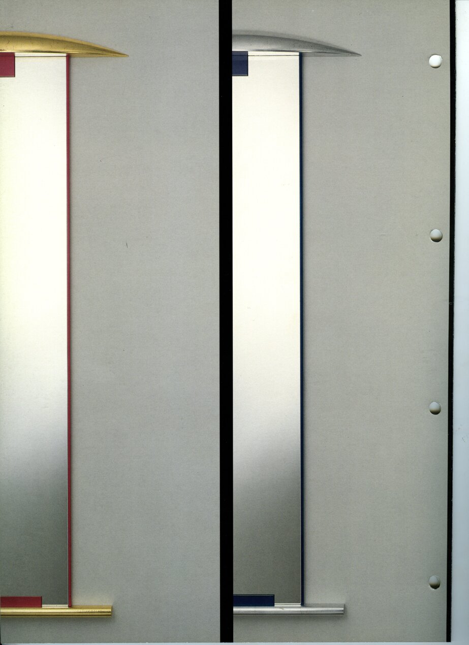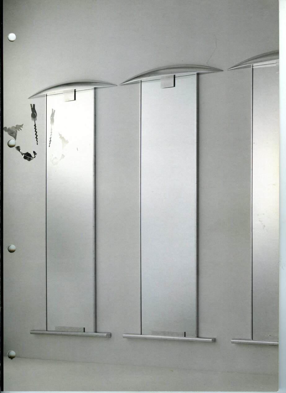 E’ un oggetto insolito, nella progettazione di Enrico Baleri, che in genere privilegia la ricerca grafica sull’immagine e l’attenzione alle soluzioni tecnologiche. E’ anche un progetto che nasce sul filo dell’autobiografia: non a caso, forse, è uno specchio. Parla di un viaggio a Vienna, di una rilettura storica di quella cultura dell’immagine che è alla base del ricostruirsi di un moderno piacere del segno, della riscoperta di un gusto per esplorazioni iconiche e simboliche a lungo tralasciate. Se la superficie superiore evoca la curva del portale della gioielleria Schullin, “hommage à Hollein”, il gioco dei materiali e dei colori incornicia con allusiva preziosità questo oggetto che si costituisce, quasi antropomorficamente, come un personaggio o una presenza sottilmente inquietante.